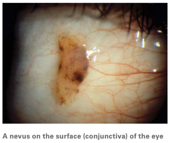 A nevus is a common, colored growth in your eye, similar to a mole on your skin. An eye nevus is usually harmless. However, it needs to be watched regularly because, like a skin mole, it could possibly develop into cancer of the eye. You should have a nevus checked by an ophthalmologist every year throughout
