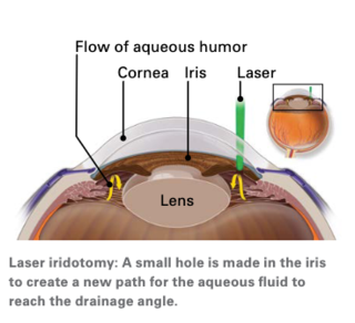 Laser iridotomy is a type of surgery to treat and prevent angle-closure glaucoma. This form of glaucoma is when your iris blocks fluid (called aqueous) from leaving the front of the eye as it should. Pressure in the eye rises and the optic nerve is damaged. Laser iridotomy helps fluid drain properly again, lowering your eye pressure.